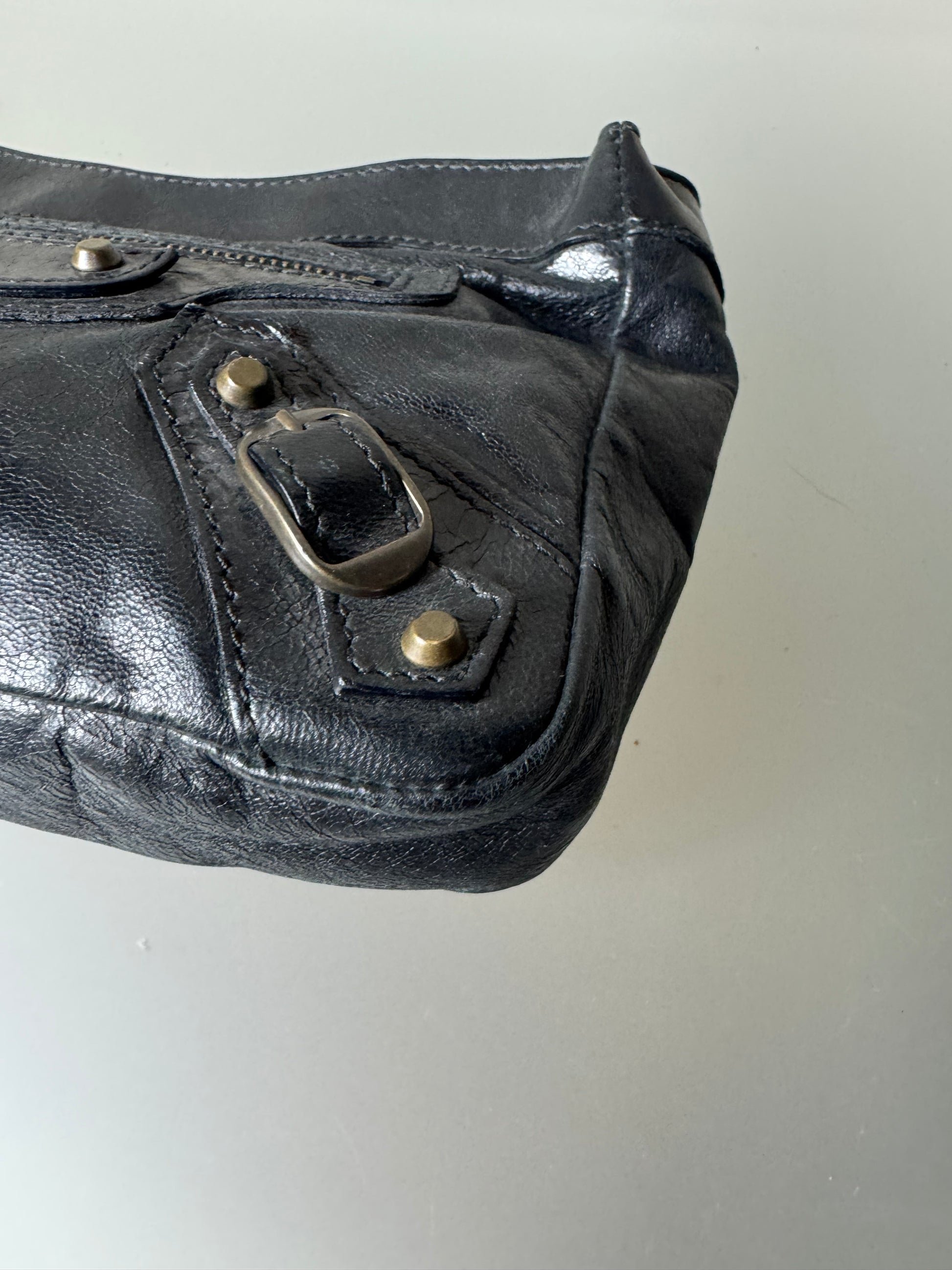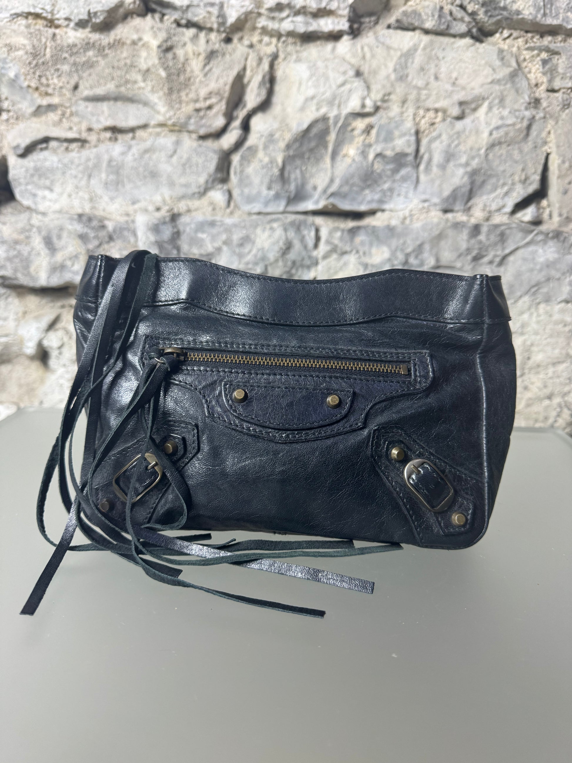 Diese elegante Balenciaga Clutch im ikonischen Classic Moto Design überzeugt durch ihren unverwechselbaren Look mit markanten Nieten, Reißverschlussfach und den charakteristischen Lederbändern. Hergestellt aus hochwertigem, weichem Leder, verkörpert sie den typischen Balenciaga Used-Look, der der Tasche ihren einzigartigen Charakter verleiht.