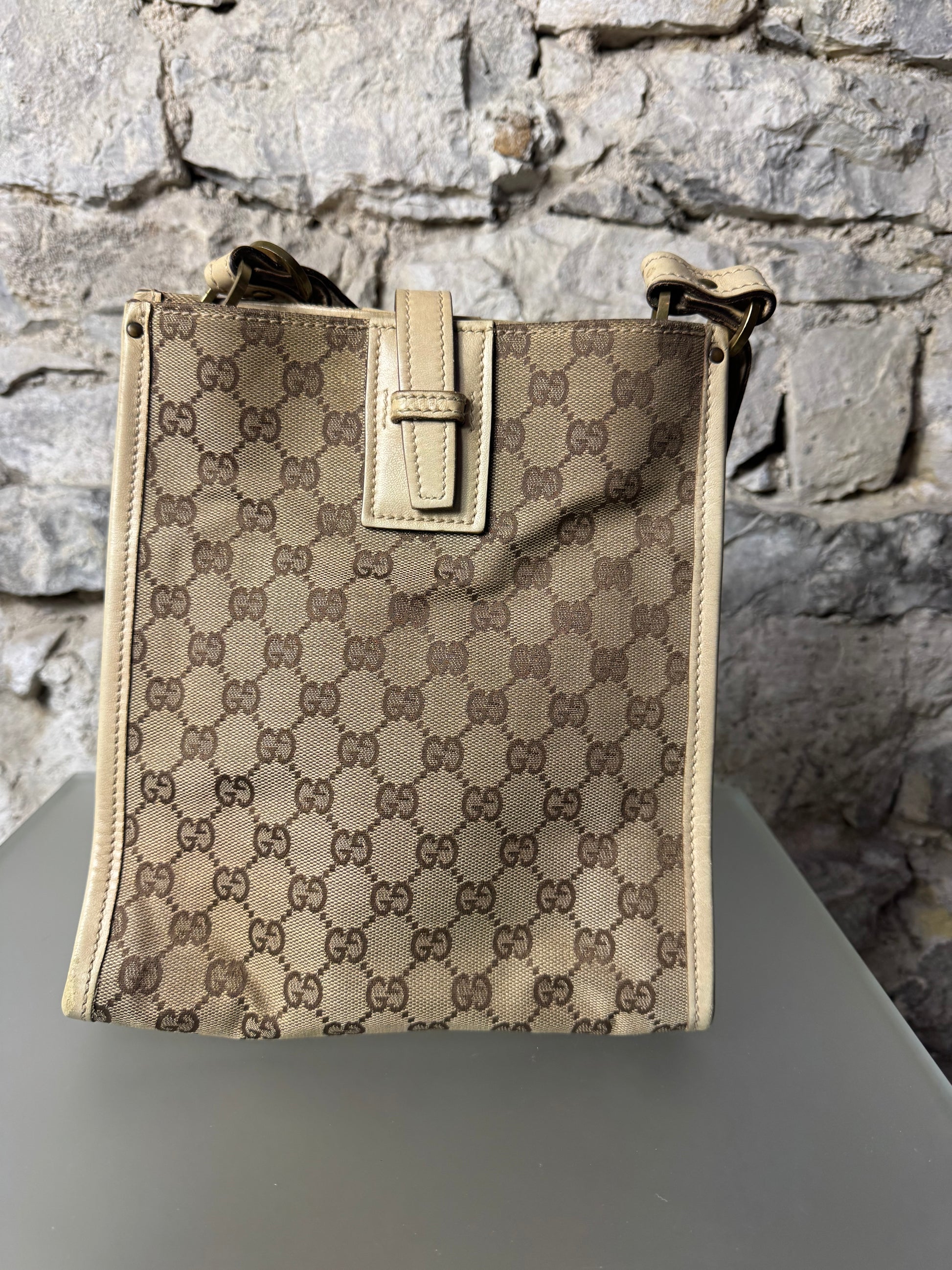 Diese klassische Gucci GG Canvas Tasche in Beige besticht durch das ikonische GG-Monogramm und den typischen Vintage-Charakter der frühen Gucci-Modelle. Mit ihrer praktischen Form bietet sie ausreichend Platz für den täglichen Gebrauch und ist ein zeitloses Accessoire für Liebhaberinnen von Vintage-Designs.