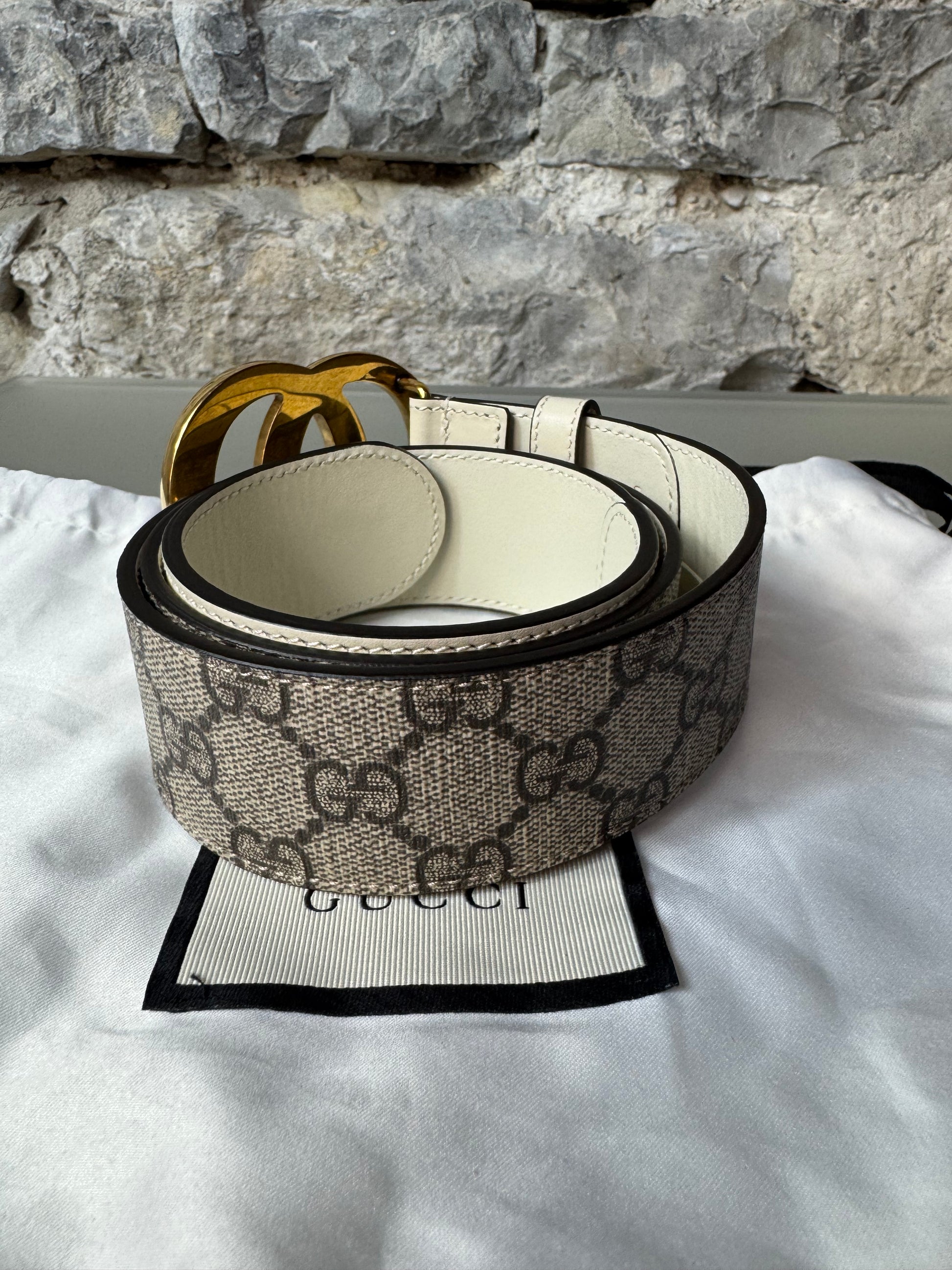 Der elegante Gucci Marmont Gürtel ist ein ikonisches Accessoire, das durch sein zeitloses Design und die edle Verarbeitung besticht. Mit der markanten GG-Schnalle in goldfarbener Ausführung und dem klassischen GG Supreme Canvas kombiniert er luxuriösen Stil mit moderner Eleganz. Auf der Innenseite ist der Gürtel mit hochwertigem weißen Leder ausgestattet, was für zusätzlichen Kontrast und Vielseitigkeit sorgt.