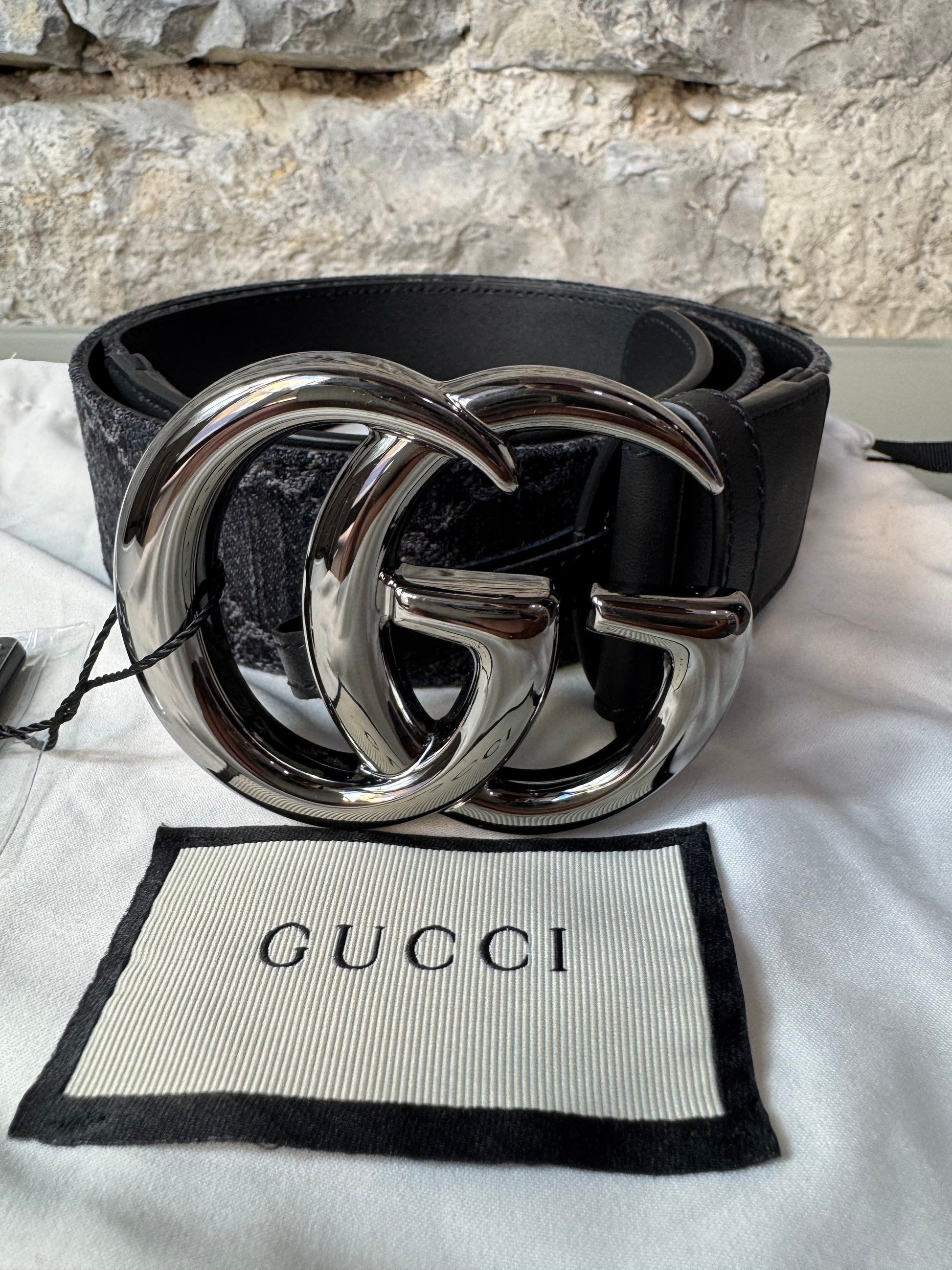 Der Gucci Marmont Gürtel vereint klassisches Design mit modernen Akzenten. Außen ist er aus schwarzem GG Supreme Canvas mit grauem Monogramm gefertigt, innen aus hochwertigem Leder. Die markante GG-Schnalle in grau-silberner Ausführung rundet das luxuriöse Design perfekt ab.