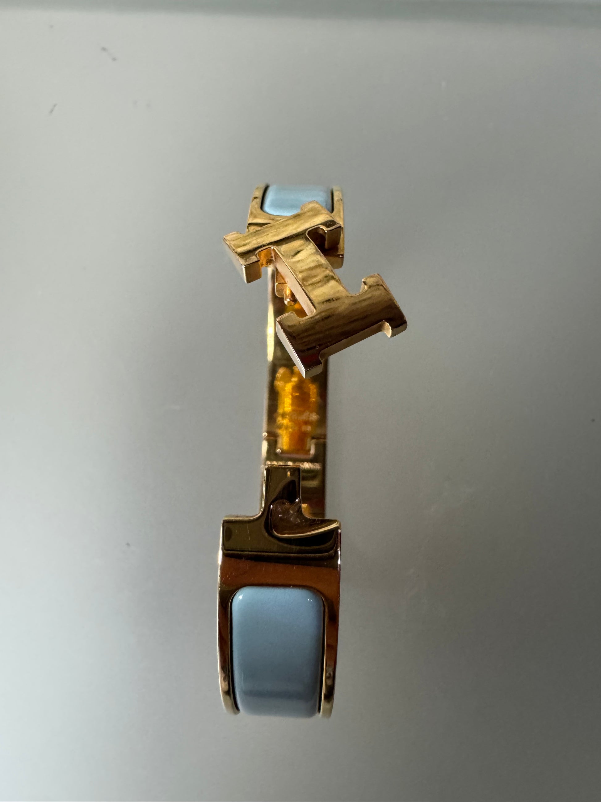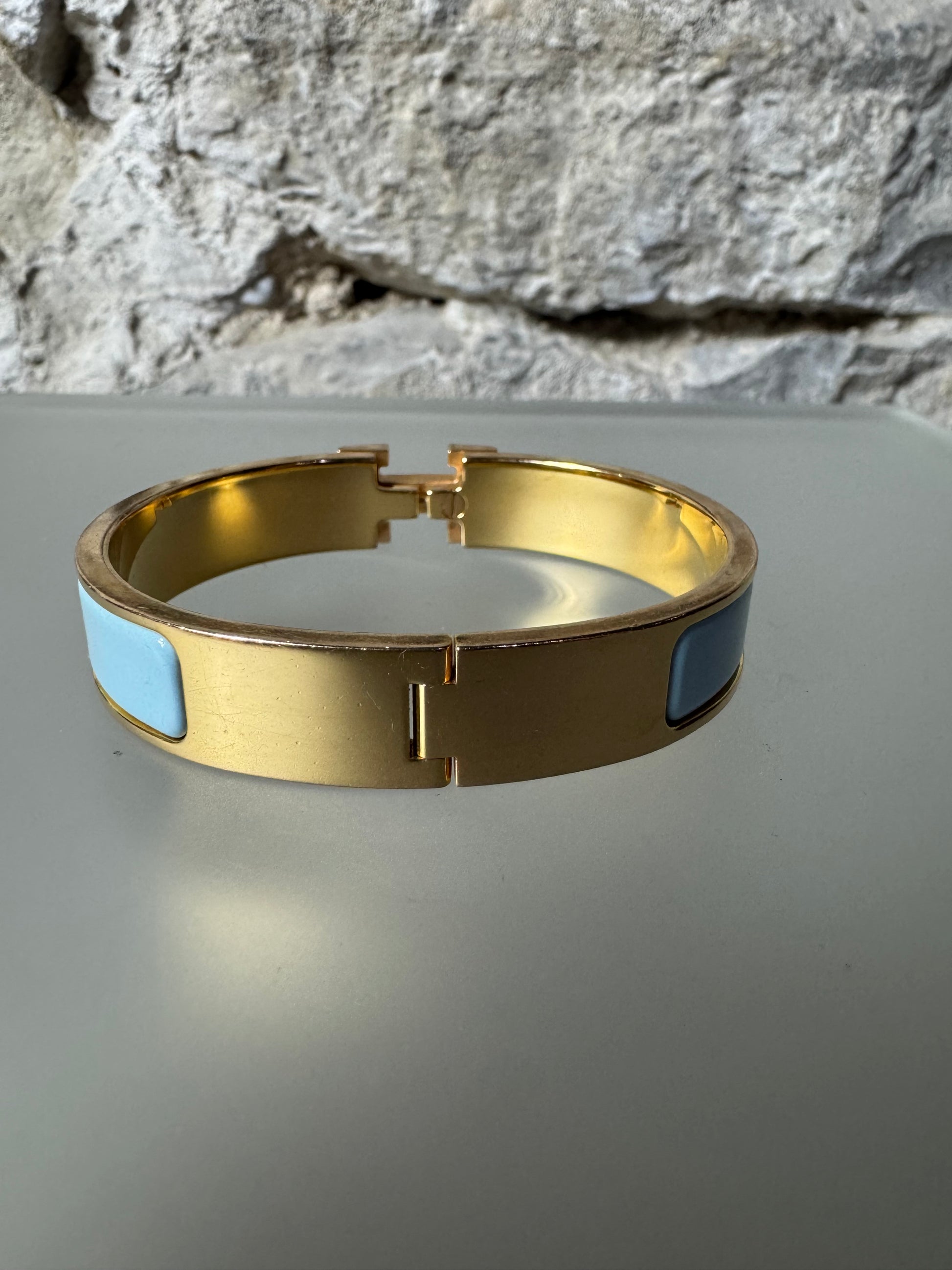 Der elegante Hermès Clic H Armreif in Gold mit hellblauem Emaille-Einsatz gehört zu den zeitlosen Klassikern der Marke. Das ikonische „H“-Design macht ihn zu einem edlen Blickfang, der jedes Outfit stilvoll aufwertet.