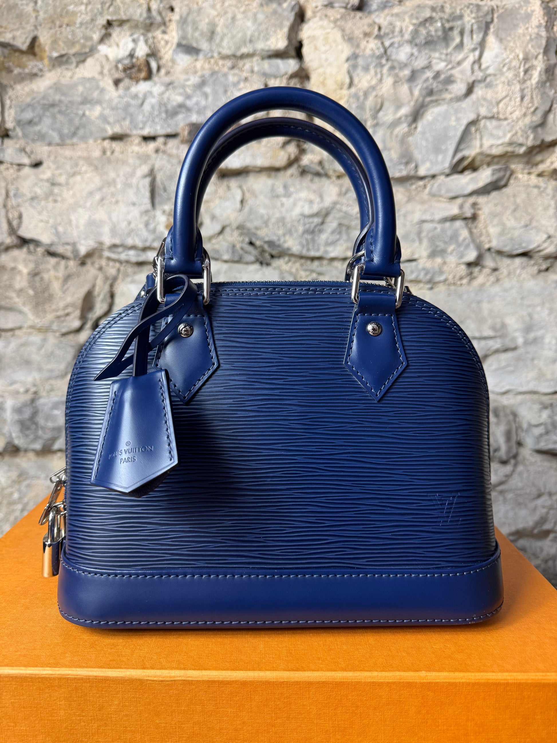 Die Louis Vuitton Alma BB aus hochwertigem Epi-Kalbsleder in eleganter Navy-Blau-Tönung ist ein stilvoller Klassiker mit moderner Ausstrahlung. Das strukturierte Leder verleiht ihr Struktur und Robustheit, kombiniert mit einem kompakten Design, das ideal für den Alltag ist.