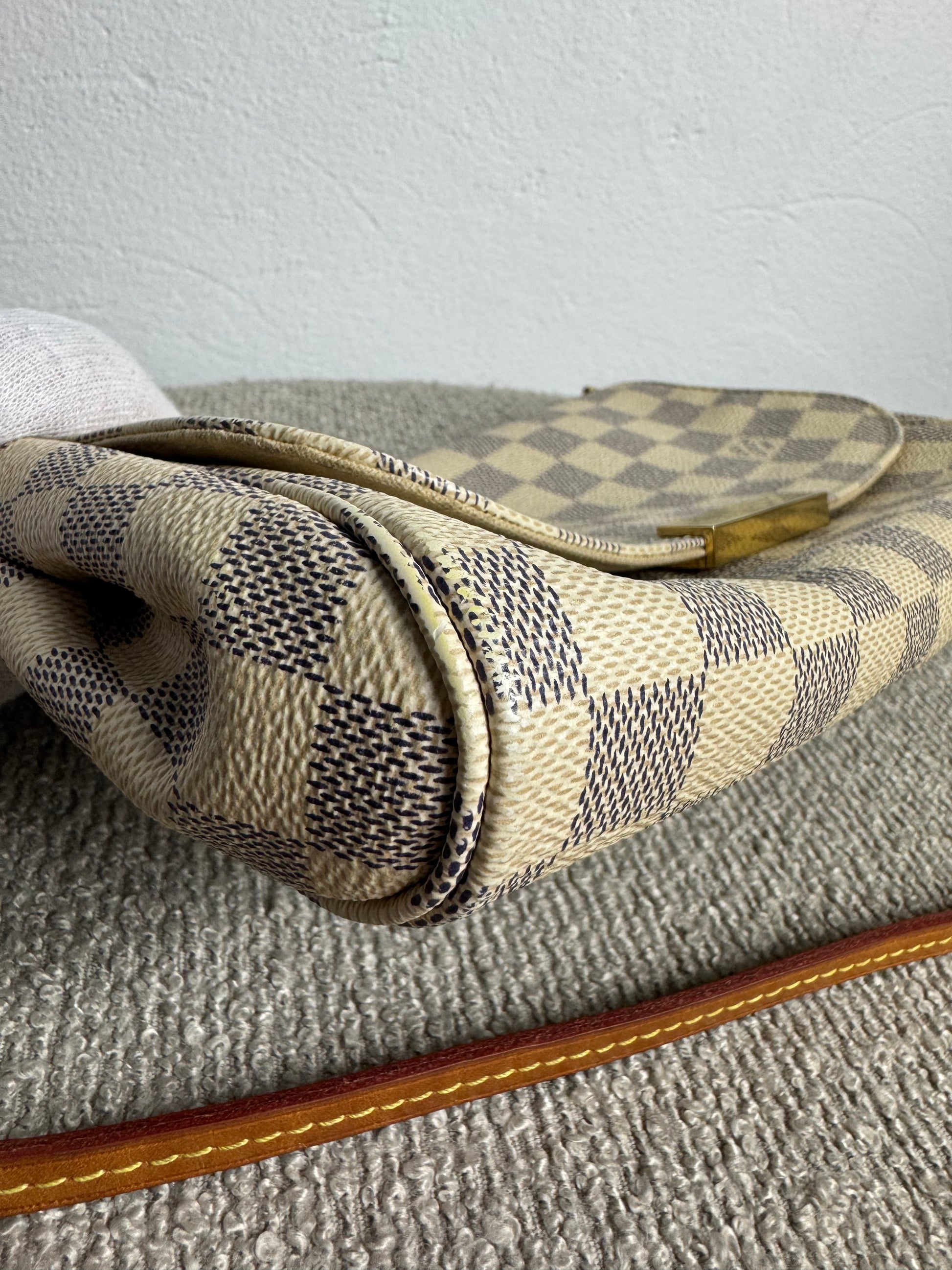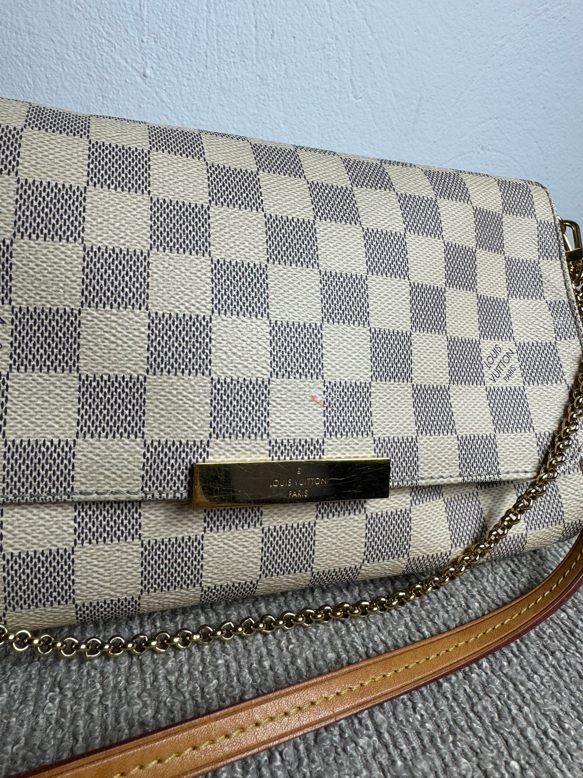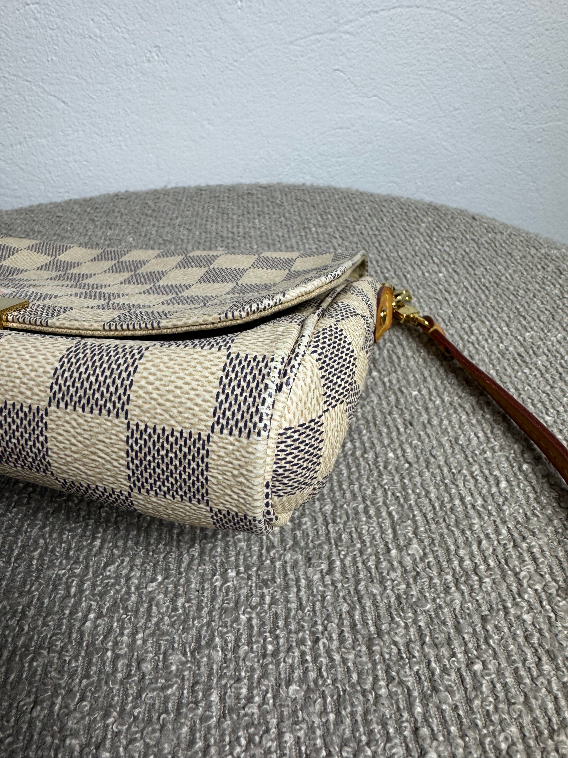 Die Louis Vuitton Favorite MM im beliebten Damier Azur Canvas ist ein elegantes und zugleich vielseitiges Modell, das sowohl tagsüber als auch abends getragen werden kann. Durch die Kombination aus goldfarbener Kette und langem Leder-Schulterriemen lässt sich die Tasche flexibel als Schultertasche, Crossbody oder Clutch tragen.