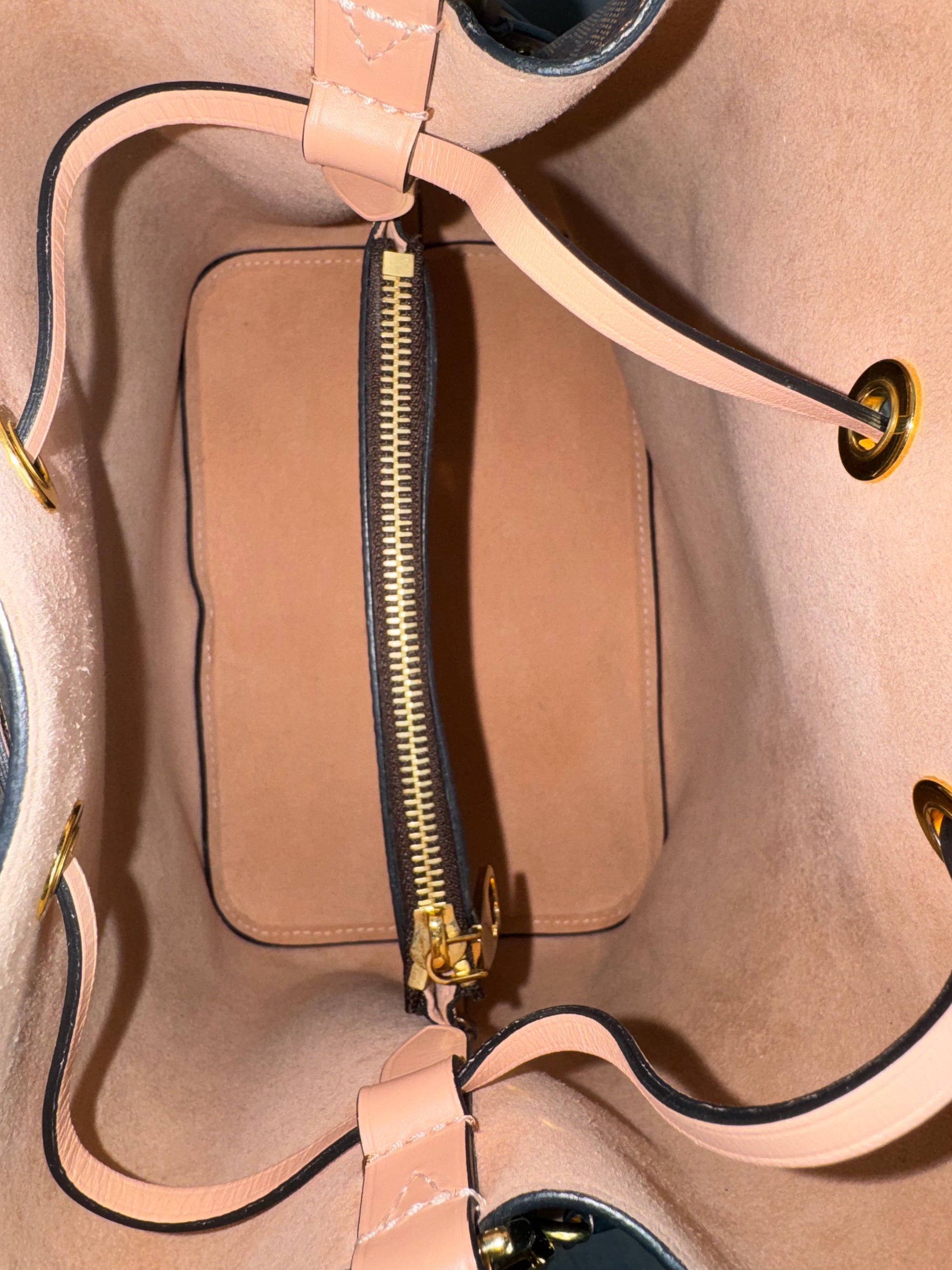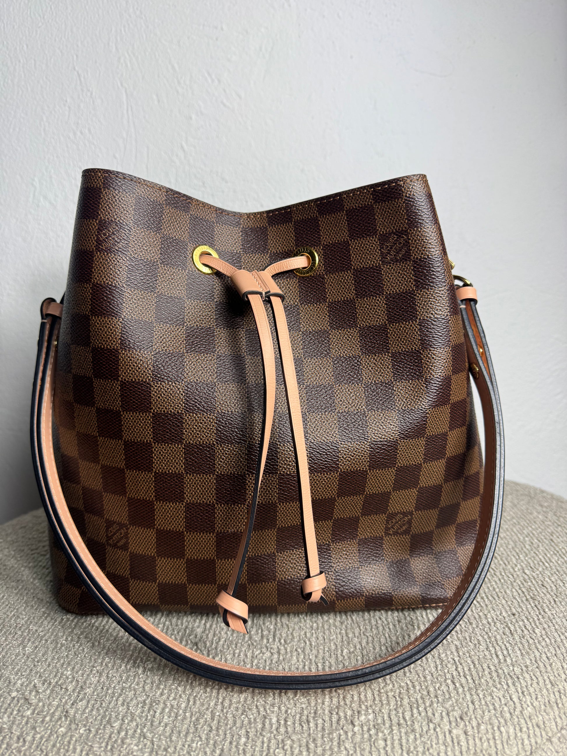 Die Louis Vuitton Néo Noé im klassischen Damier-Ebene-Canvas mit lachsfarbenem Innenfutter ist eine moderne Neuinterpretation des ikonischen Beuteltaschen-Designs. Sie verbindet zeitlose Eleganz mit hoher Alltagstauglichkeit und einem frischen Farbakzent im Inneren.