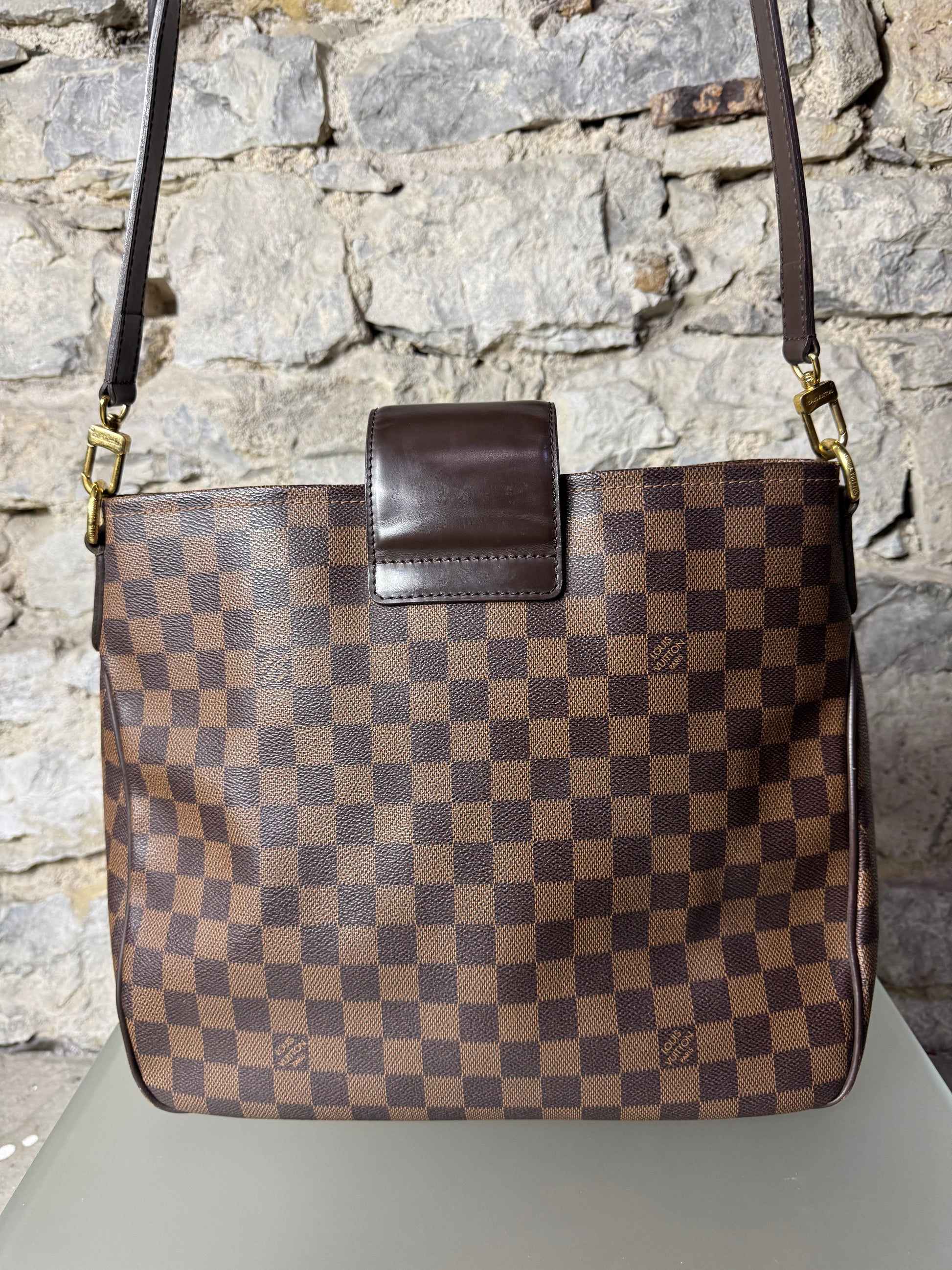 - Material: Damier Ebene Canvas mit Lederbesatz