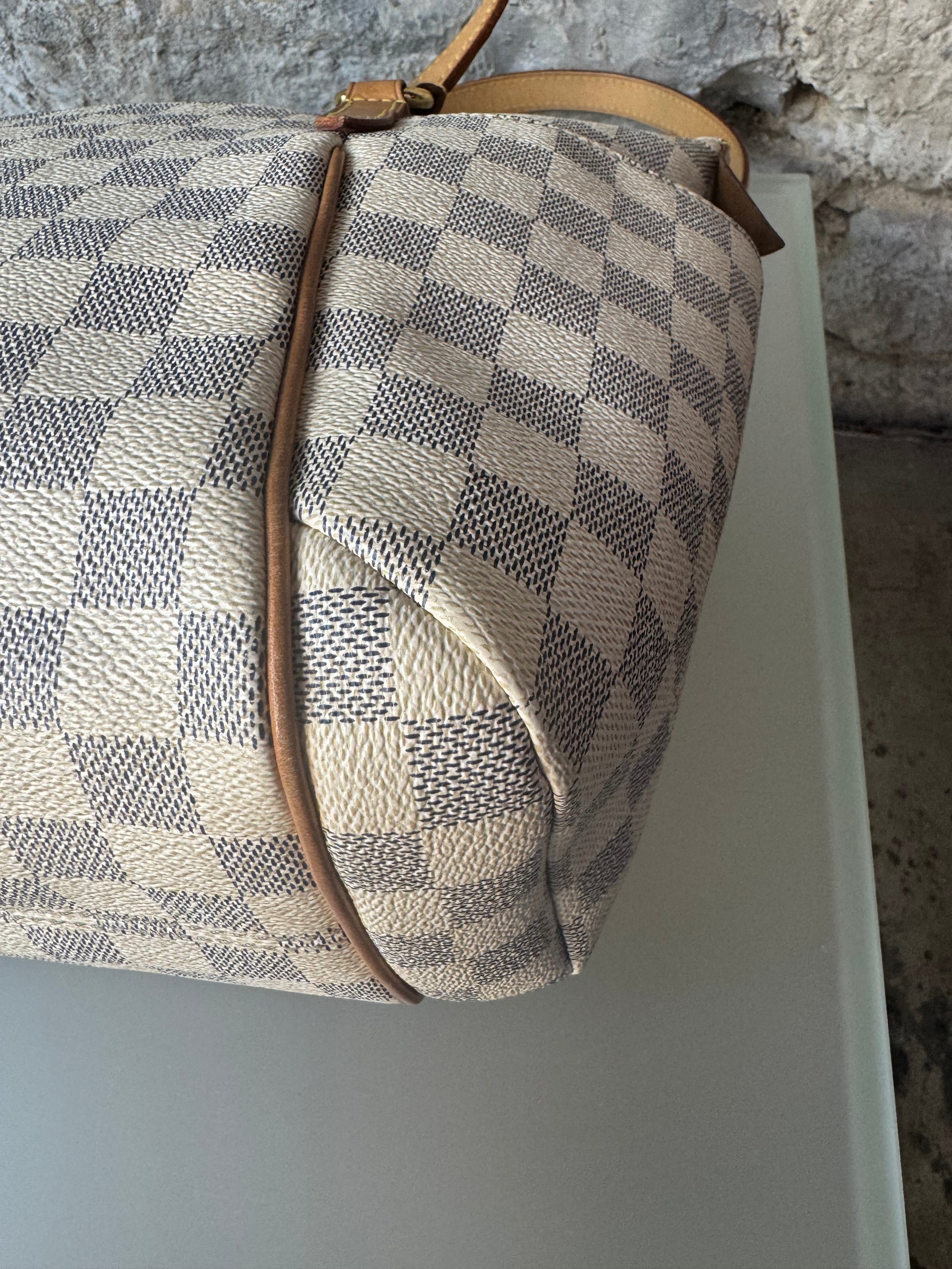 - Material: Damier Azur Canvas mit Lederdetails