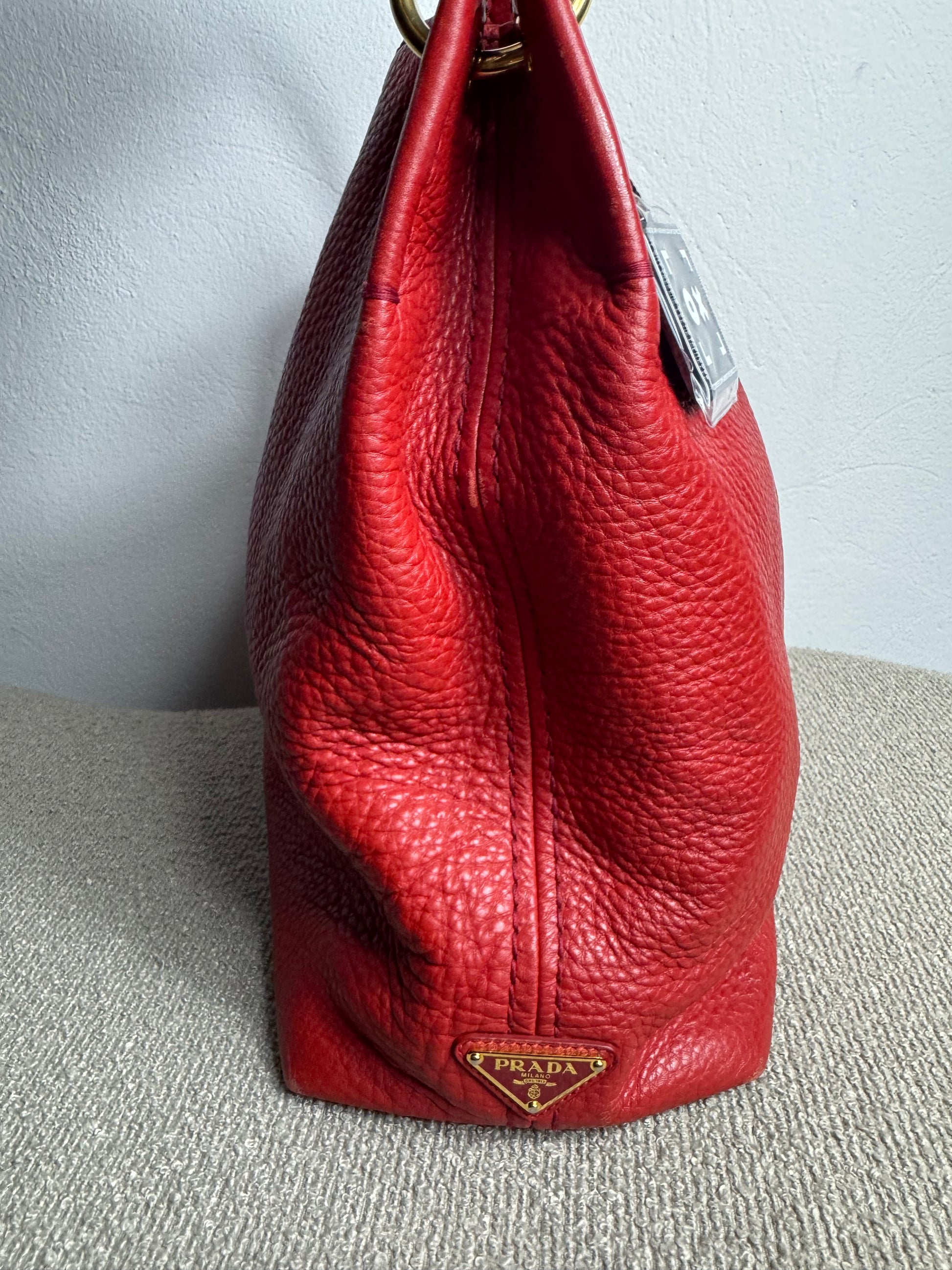 Diese elegante Prada Tasche aus hochwertigem rotem Leder überzeugt durch ihr zeitloses Design und die charakteristische Prägung mit dem PRADA Milano-Logo auf der Front. Die weiche Lederstruktur verleiht der Tasche eine edle Optik und macht sie zu einem stilvollen Begleiter für Alltag und besondere Anlässe.